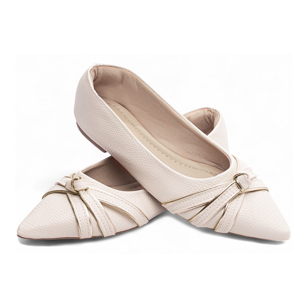 Material: Napa Lezard Off White / Napa Ouro Light; Forro: Cacharrel, material espumado para maior conforto, na cor bege claro; Enfeite: Tiras Trançadas em Nó; Palmilha: 4 mm de Espessura, Espuma em EVA, Revestida em Napa Bege; Solado em PVC Flexível com antiderrapante e na cor Bege. A sapatilha feminina bico fino é a escolha perfeita para quem busca unir estilo e conforto no dia a dia. Com um design sofisticado e minimalista, ela traz um toque de elegância a qualquer look, seja para o trabalho, uma reunião ou um evento casual. Seu formato de bico fino confere uma silhueta mais alongada e refinada, enquanto o detalhe inspirado no estilo mocassim traz personalidade e charme ao look. Além disso, o forro acolchoado e a palmilha macia garantem o máximo de conforto, permitindo que você a use o dia todo sem incômodos.